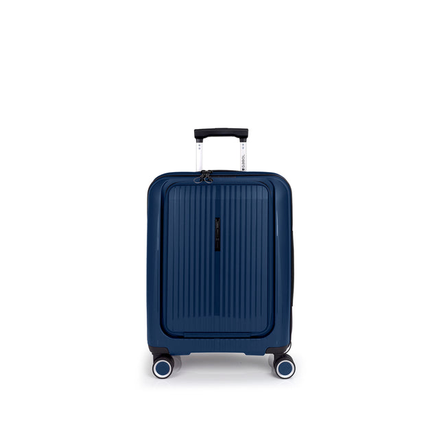 Cabin suitcase with rigid front pocket, with expandable and capacity up to 41.7 L. manufactured in polipropileno. Its interior is composed of a lining of recycled material, with double separator and pockets. 4 double wheels. It has a front pocket for the 15.6 '' laptop. Security zip.