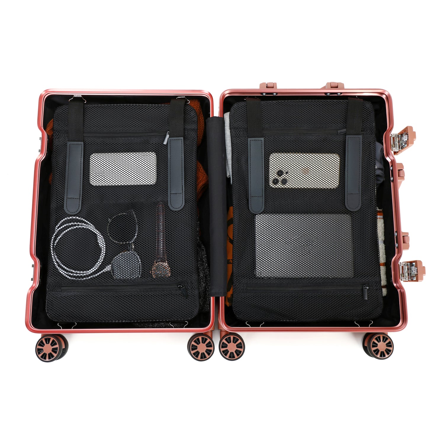 Het ruime interieur van Praga Aluminium is ontworpen om alle ruimte te hebben die u nodig hebt tijdens uw reizen. De twee compartimenten hebben bevestigingslinten, delen van pads en zakken van verschillende maten om al uw bezittingen op een ordelijke manier te kunnen redden.