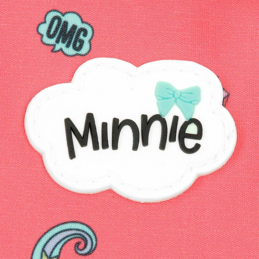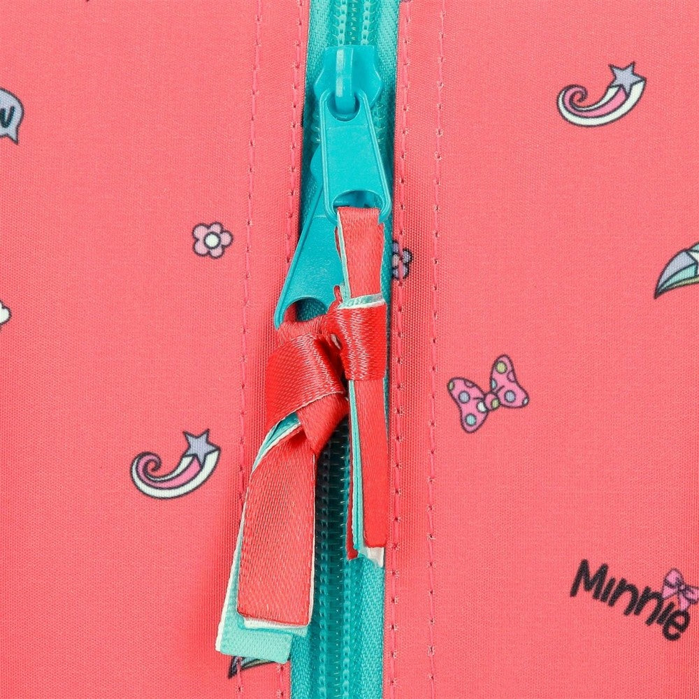 Con entusiasmo y alegría, Minnie te anima en tú día a día, en el cole, de viaje, de paseo o en tus clases extraescolares a llevarlo todo con ganas. En tu mochila, estuche, bolsa de viaje o neceser, llevarás a Minnie de una forma divertida gracias al color coral combinado en turquesa, que hace de esta colección una preciosidad.