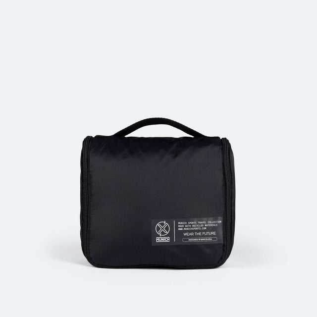 Toiletry/Neceser de viaje fabricada en poliester reciclado. Interior con gancho para colgar, bolsillo frontal con cremallera y dos bolsillos en la tapa. Interior con elastico para sujetar distintos objetos. Diseñado en Barcelona.