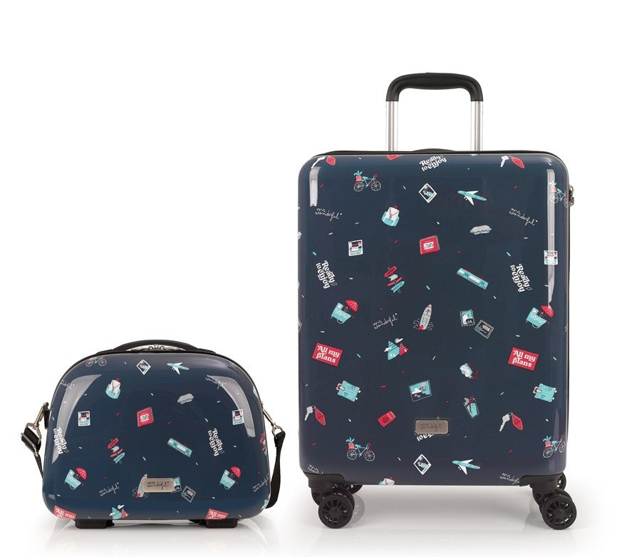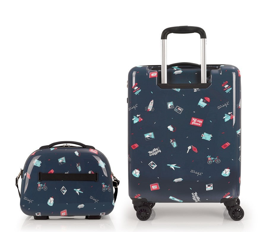 Colección Plans de Mr. Wonderful x Gabol, con un original estampado de elementos de viaje. Ready to Enjoy. Set de maleta de cabina más neceser rígido, con capacidad total de 52,2 L. El material de fabricación es ABS con film y su interior está compuesto por un forro de alta calidad con bolsillos. Cerradura TSA. La maleta tiene un tamaño apto para cabina y la constitución de sus materiales hacen que su peso sea ligero, perfecto para la movilidad. El neceser incluye bandolera y acople para la maleta que facilita su transporte.
