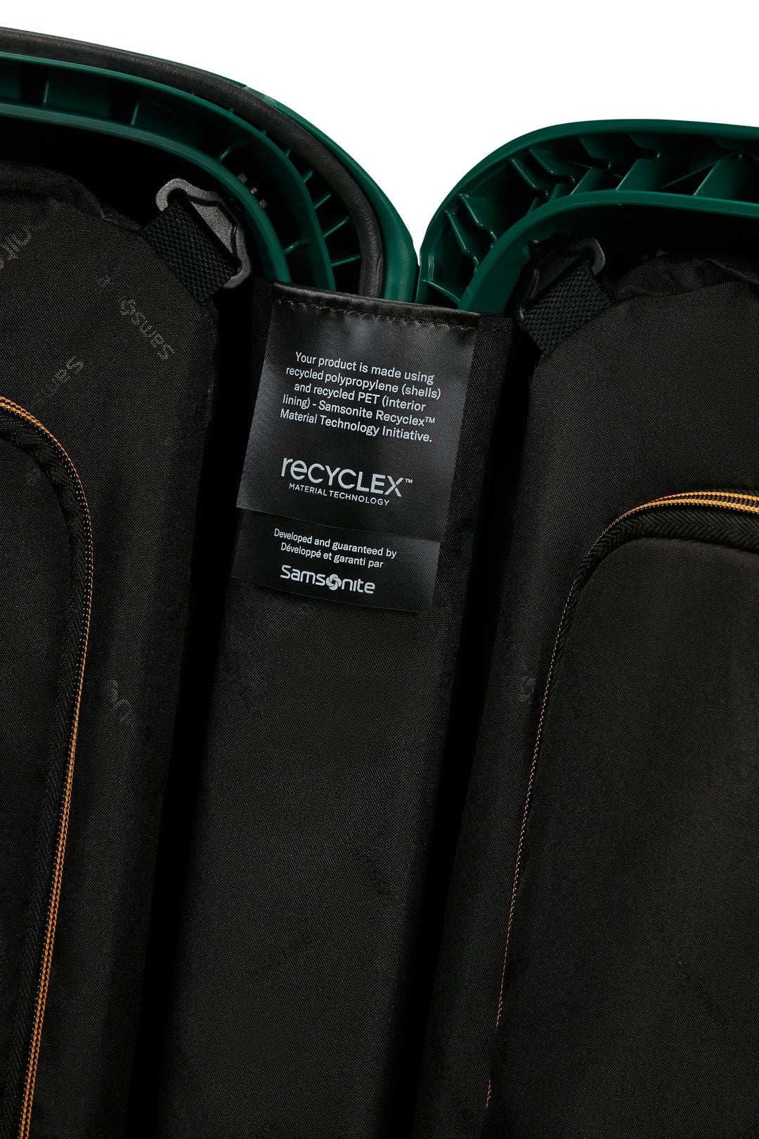 - El revestimiento interior y las correas interiores están fabricados con PET resp, 97% y 100 % reciclado postconsumo, dentro de nuestra iniciativa de tecnología de materiales Recyclex™. El revestimiento y el respaldo están hechos con materiales vírgenes.