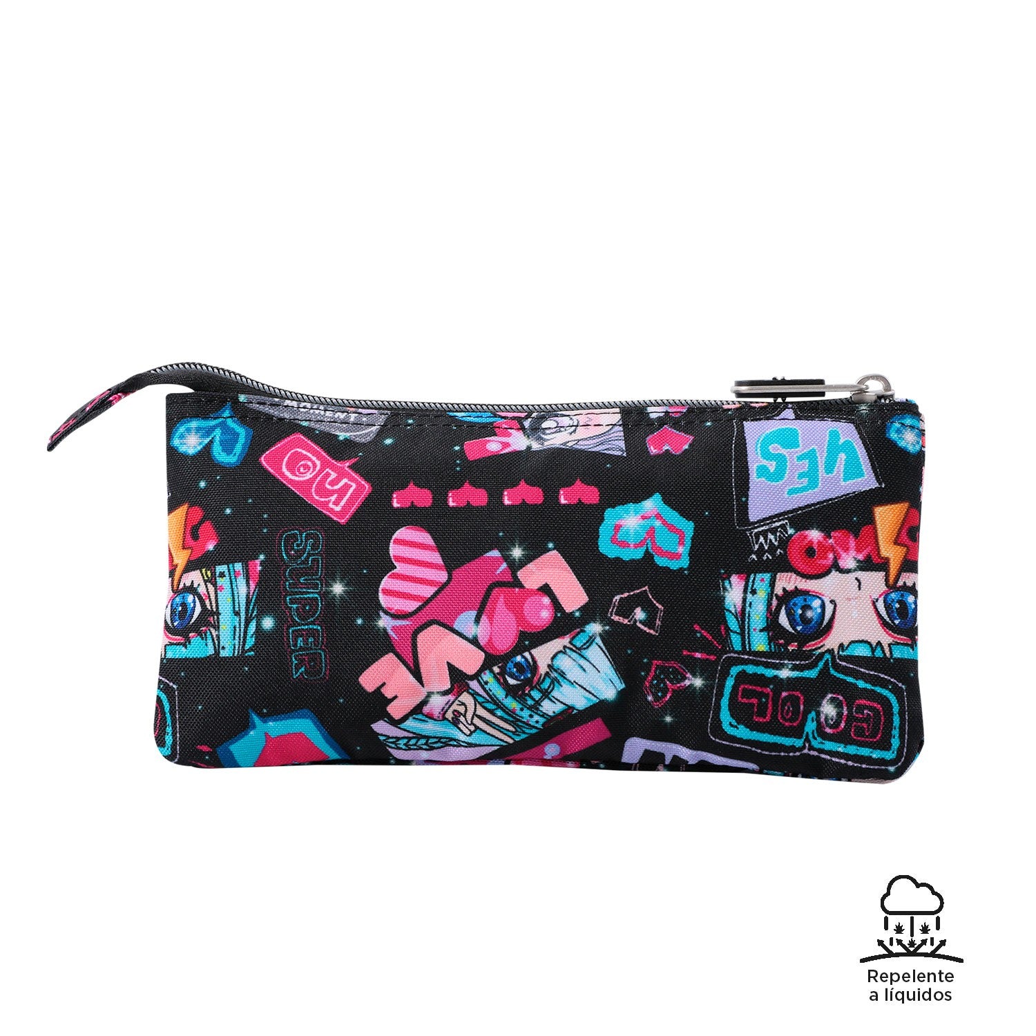 Estuche escolar con tres compartimentos y diseño compacto perfecto para ir a clase con todo lo necesario.